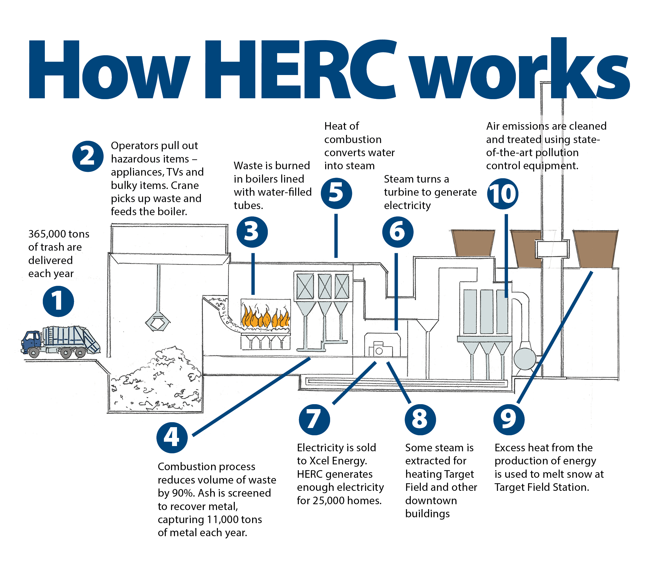 Hennepin County offers facility tours of the Hennepin County Energy Recovery Center (HERC) waste-to-energy facility. HERC is a waste-to-energy facility where waste is received and burned to generate steam for the downtown district energy system and electricity sold to Xcel Energy.